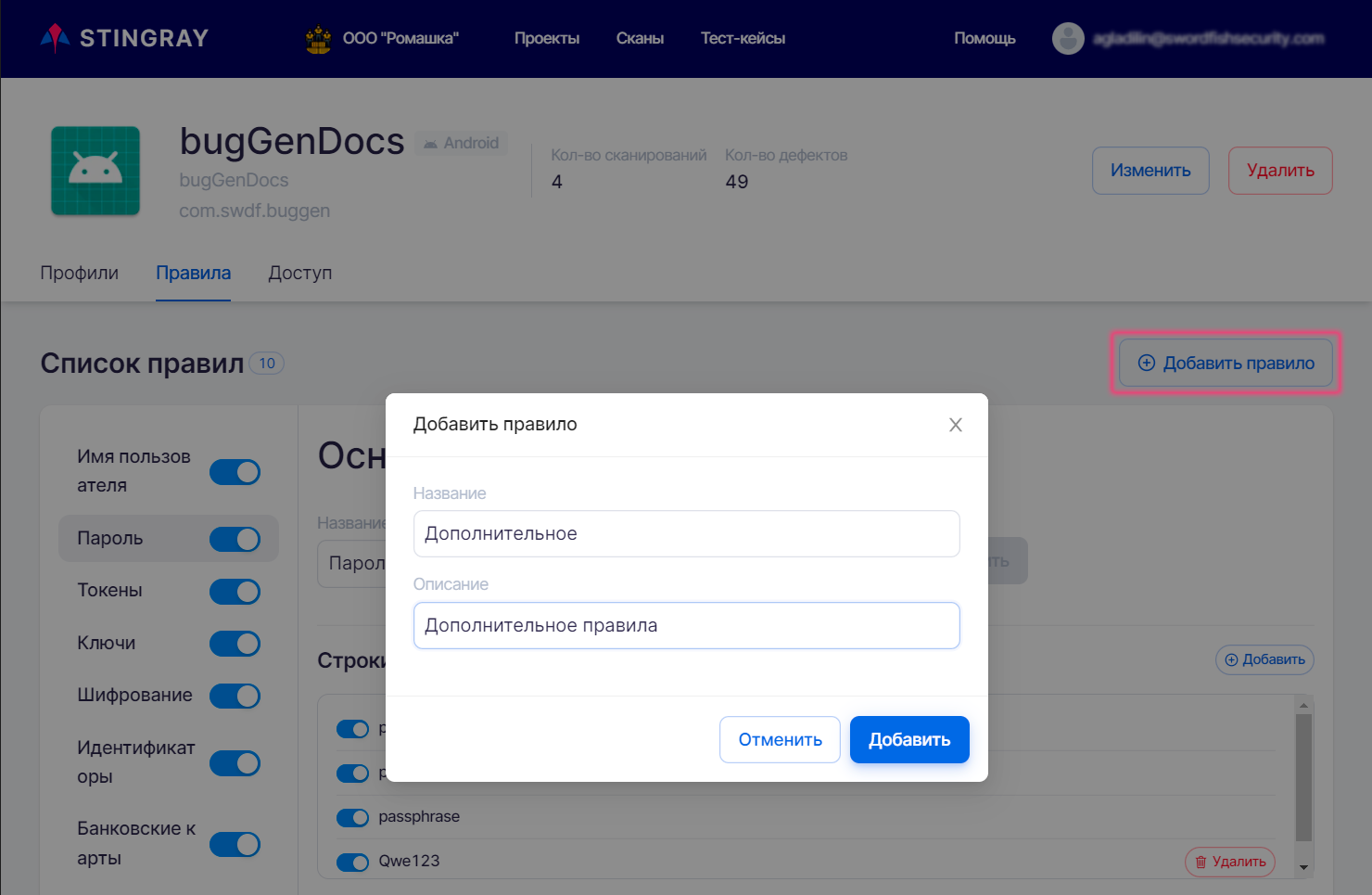 , то правило является активным и будет применяться при анализе собранных данных для поиска уязвимостей. Если селектор находится в выключенном положении