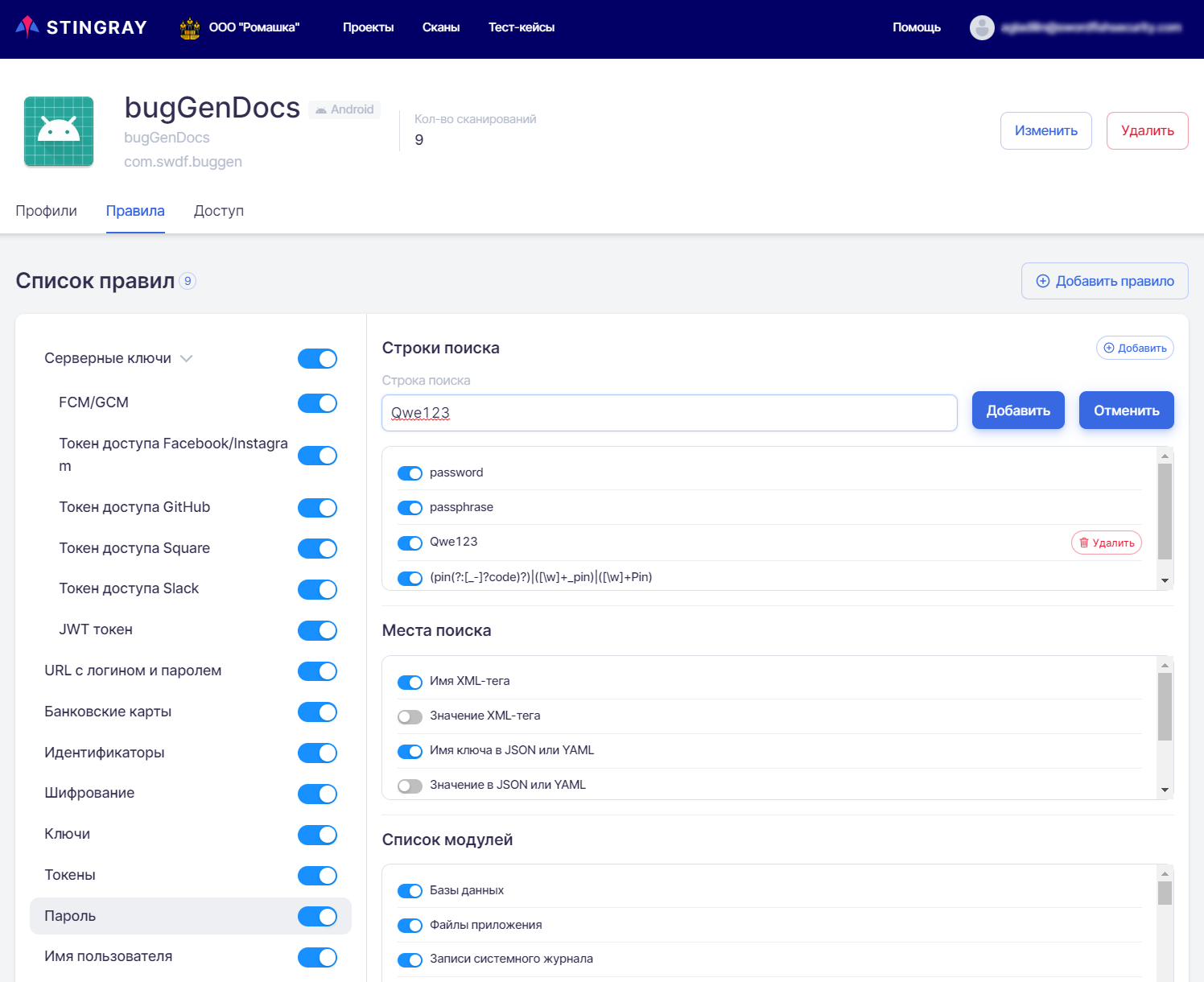 . Для изменения необходимо нажать на селектор. Его положение изменится и будет отображено уведомление об успешном изменении. - Список модулей, для которых будет применяться данное правило. Любой из модулей сканирования в системе можно выбрать и добавить в правило. Включение и отключение происходит аналогично полю Места поиска.