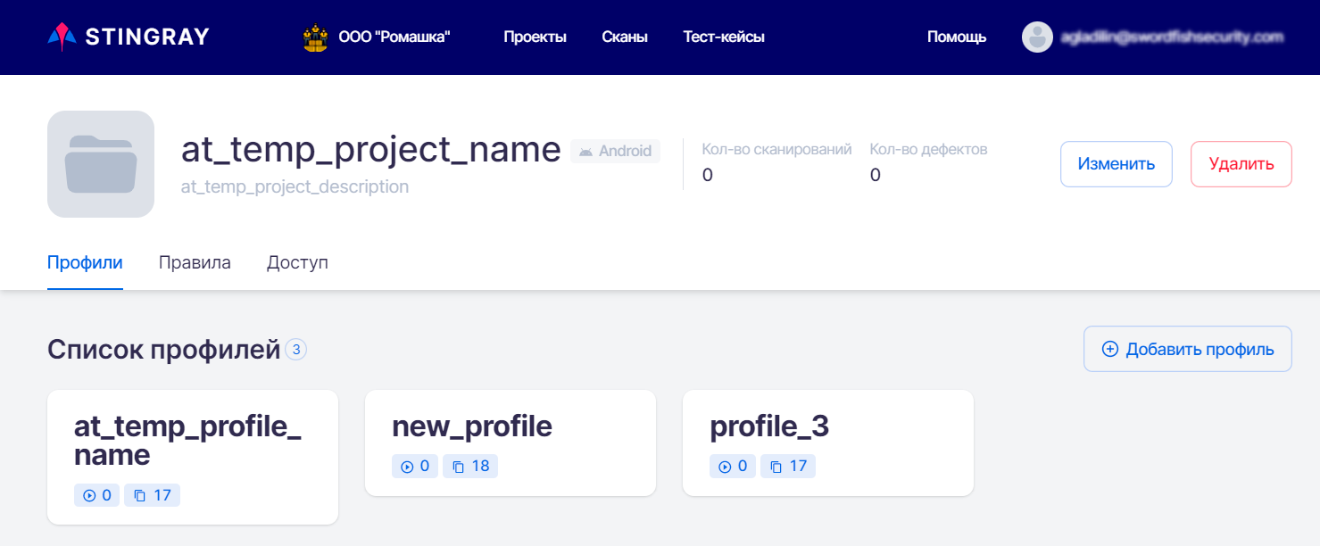 Профили сканирования относятся к проектам. На странице Проекты представлены все существующие в системе проекты и их профили сканирования. Каждый профиль представлен в виде карточки с краткой информацией о нем. Для каждого проекта показан список его профилей. На этой странице можно добавить новый профиль сканирования для существующего проекта или просмотреть информацию о существующих профилях.