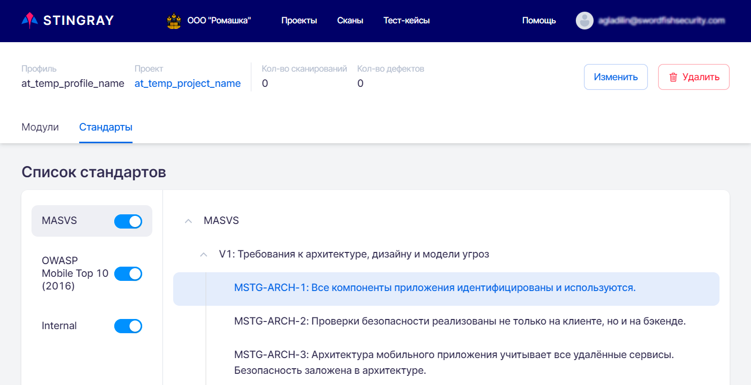 На странице профиля можно получить информацию о настройках модулей сканирования в данном профиле (включить, отключить или настроить их), просмотреть и включить или отключить стандарты безопасности, на соответствие которым будет проверяться анализируемое данным профилем приложение. В верхней части страницы представлена общая информация о профиле:
