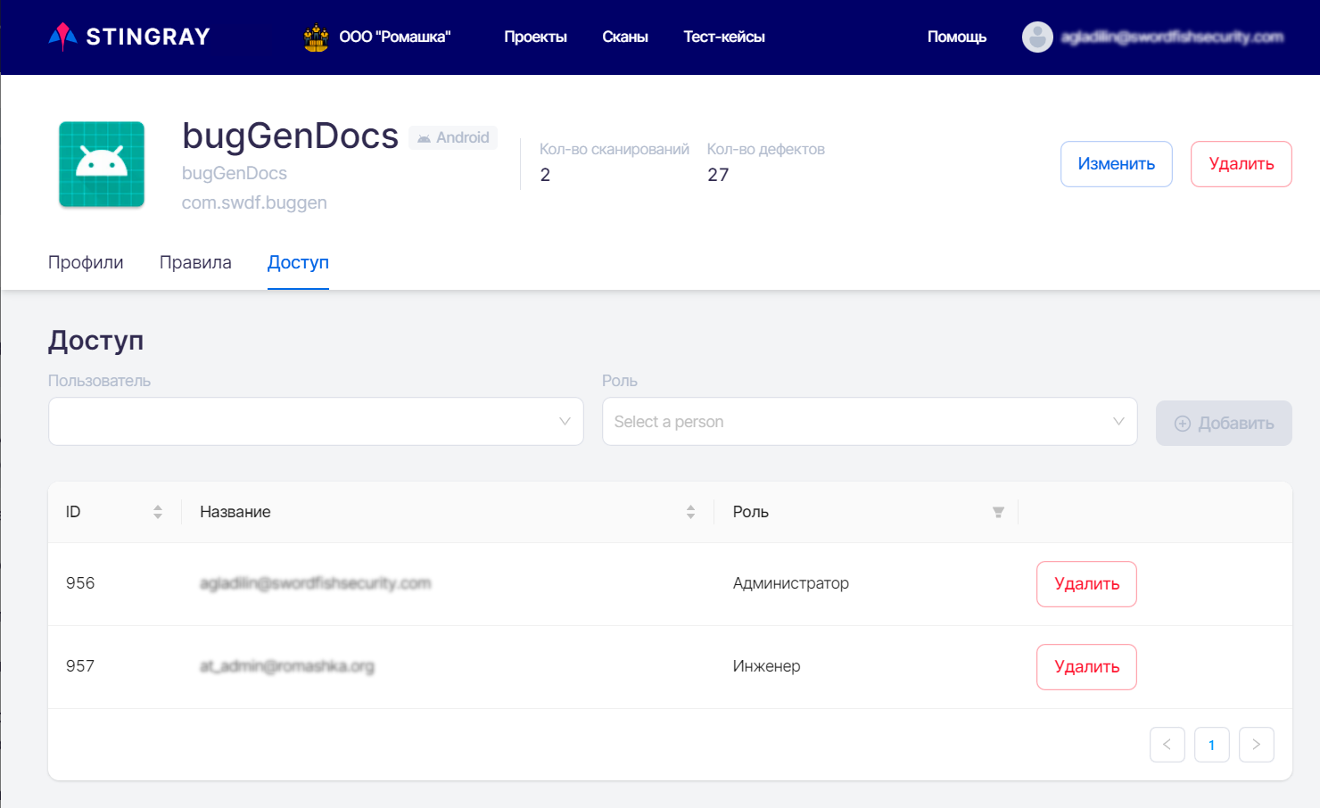 На вкладке Доступ осуществляется назначение проектных прав доступа как для отдельных пользователей, так и для групп. Более подробная информация о ролевой модели приложения приведена в разделе «Пользователи, группы, проекты».