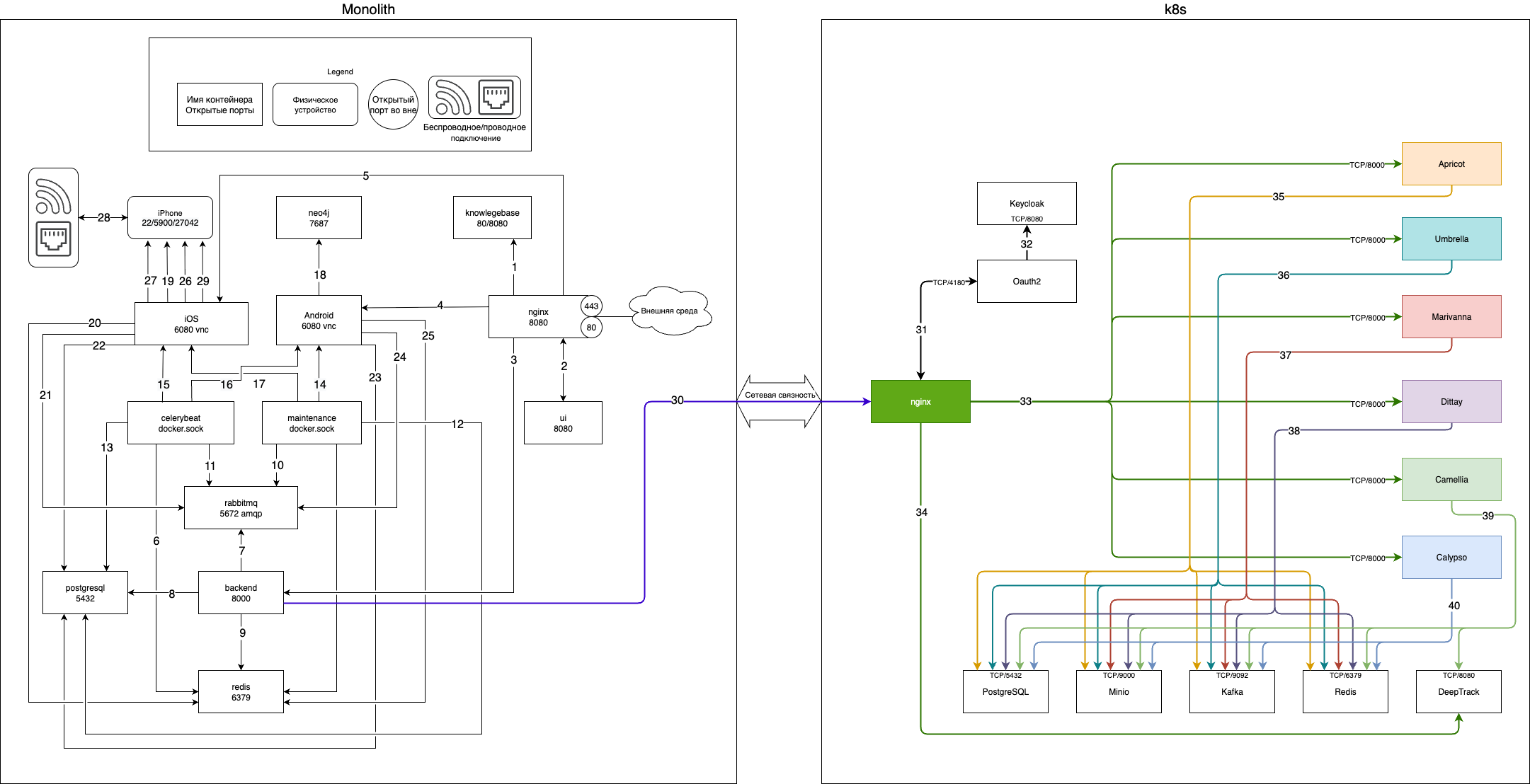 | 40 | Calypso | Infrastructure services | 5432/PSQL, 9000/S3, 9092/Kafka, 6379/Redis | TCP | Взаимодействие с сервисами инфраструктуры |