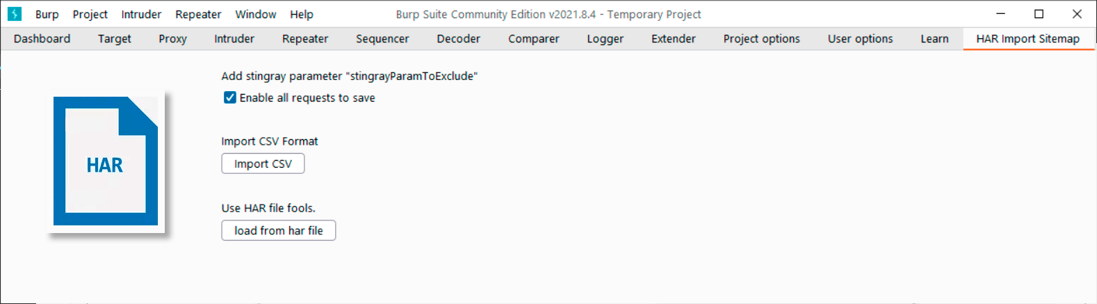 В результате успешного добавления плагина в строке меню Burp Suite появится новый пункт HAR Import Sitemap.
