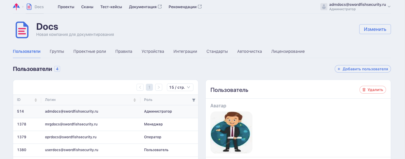 На странице настроек доступны несколько вкладок: Пользователи, Группы, Проектные роли, Правила, Устройства, Интеграции, Стандарты, Автоочистка, Лицензирование.