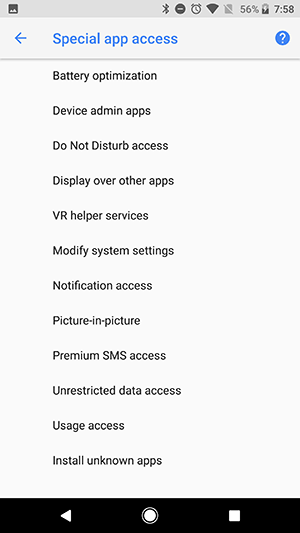 Special permissions — соответствуют конкретным операциям приложения. Только Android-платформа и OEM (оригинальный производитель оборудования) могут определять специальные разрешения в тех случаях, когда хотят защитить доступ к особенно мощным действиям, таким как отрисовка поверх других приложений. Этим разрешениям система присваивает appop уровень защиты. В отличие от runtime permissions, здесь пользователь должен предоставить специальные разрешения на странице «Доступ к специальному приложению» в системных настройках. Приложения могут отправлять туда пользователей с помощью Intent, который приостанавливает ПО и запускает соответствующую страницу настроек для данного специального разрешения. После того, как пользователь вернется в приложение, оно может проверить, предоставлено ли разрешение в функции onResume().