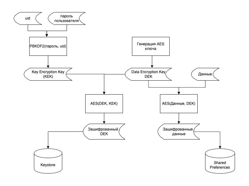 Чтобы обработать ситуацию, когда мы используем пароль пользователя в процедуре расширения ключа и шифрования данных, а пользователь внезапно решил сменить пароль, возможно применение алгоритма KEK&DEK (Key Encryption Key & Data Encryption Key). При таком подходе мы генерируем ключ шифрования для данных при помощи SecureRandom, шифруем на нем нужные нам данные, а после для безопасного хранения этого ключа используем процедуру расширения на основе пароля пользователя и получившимся ключом шифруем ключ шифрования данных. Схематично это выглядит следующим образом.