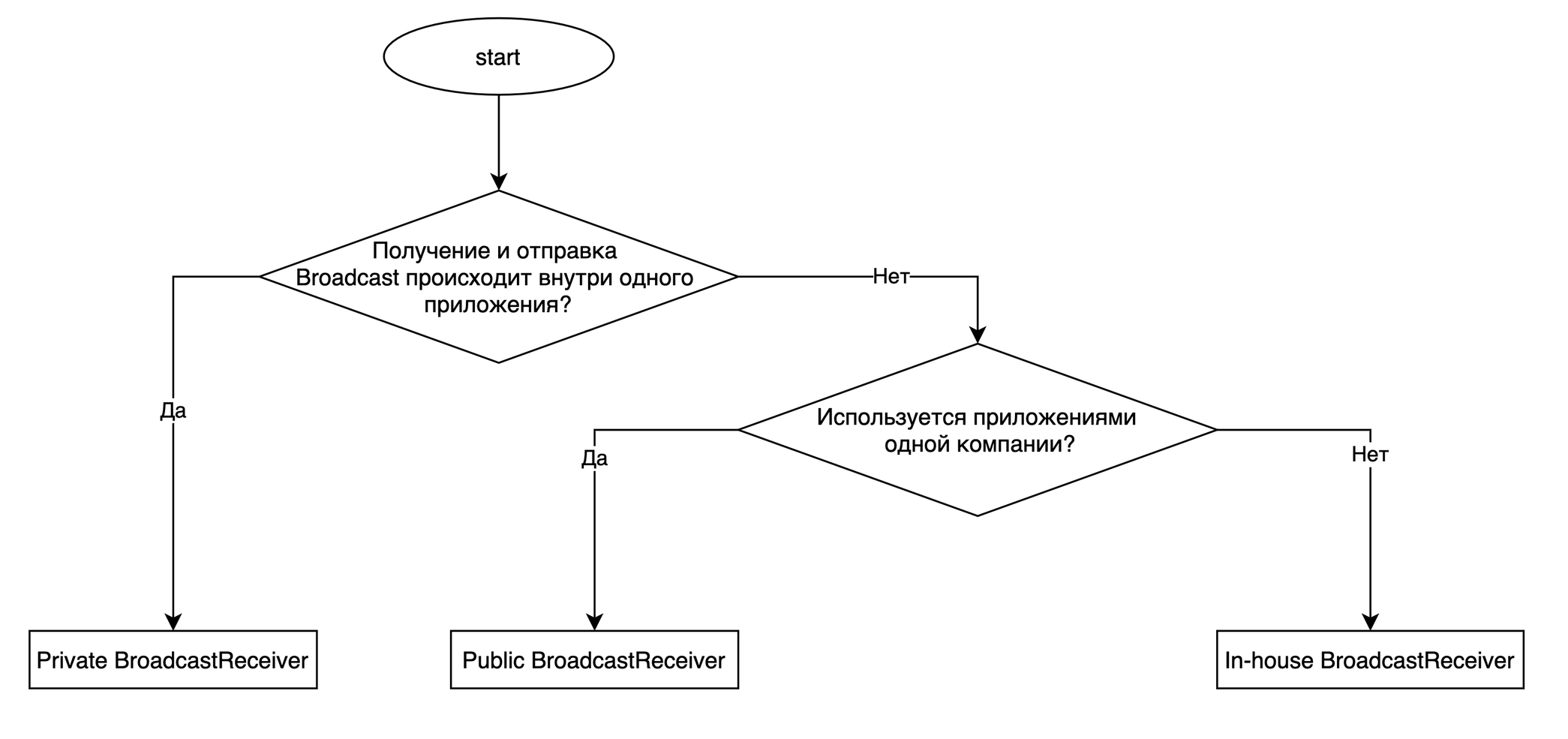 | Private BroadcastReceiver | BroadcastReceiver, который не может получать Broadcast из других приложений, и поэтому является наиболее защищённым |