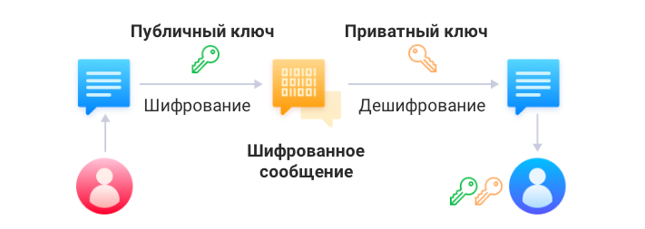 При асимметричном шифровании используются два ключа, которые называются публичный (public key) и приватный (private key). Эти ключи математически связаны друг с другом и их пара уникальна. На публичном ключе происходит шифрование данных, а приватным — расшифровка. Данный алгоритм используют чаще, если есть необходимость передавать данные куда-либо вне устройства.