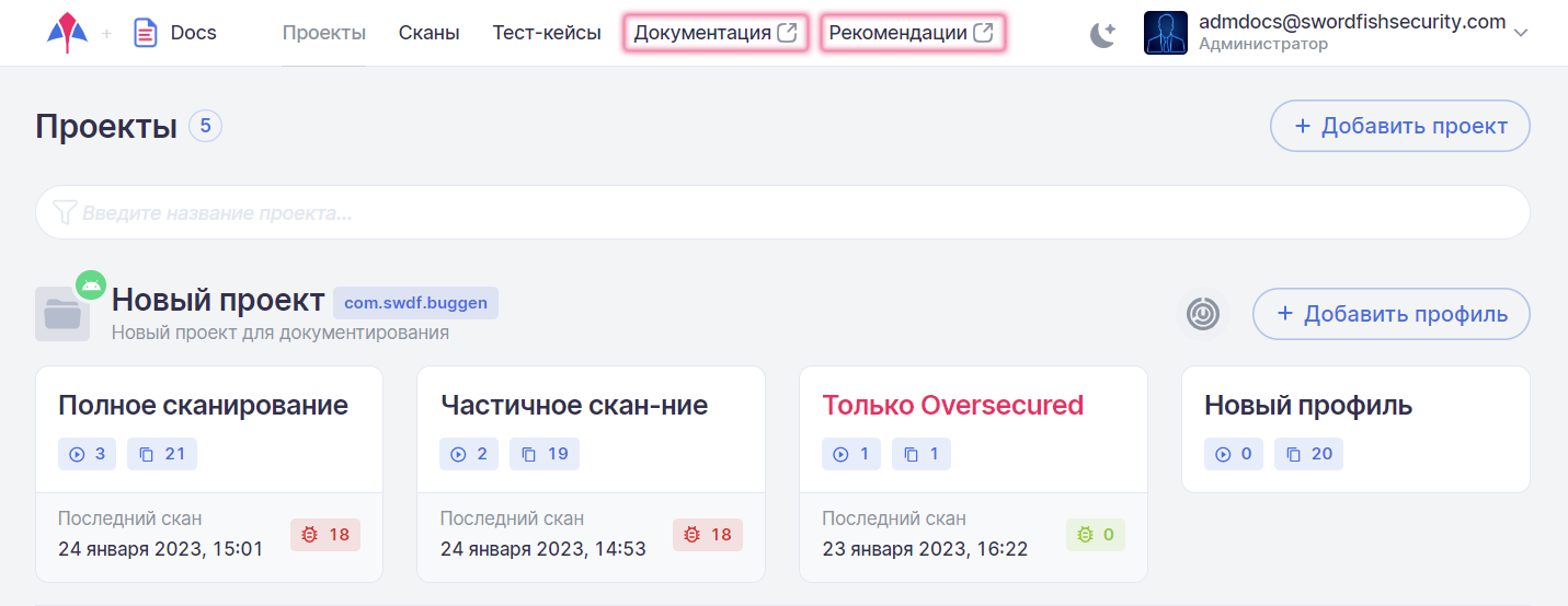 Для перехода в необходимый раздел выберите соответствующий пункт основного меню Документация или Рекомендации.