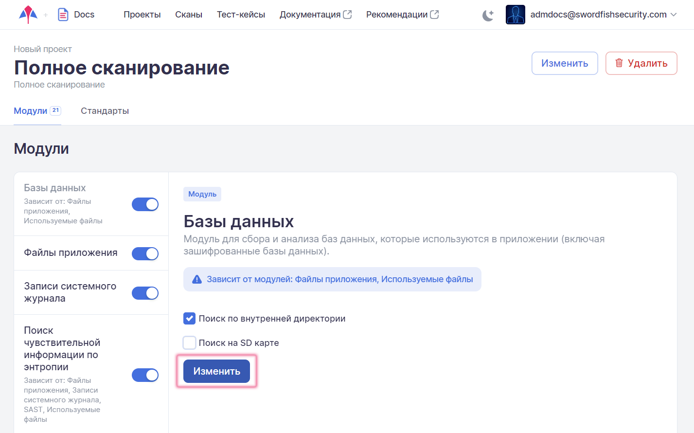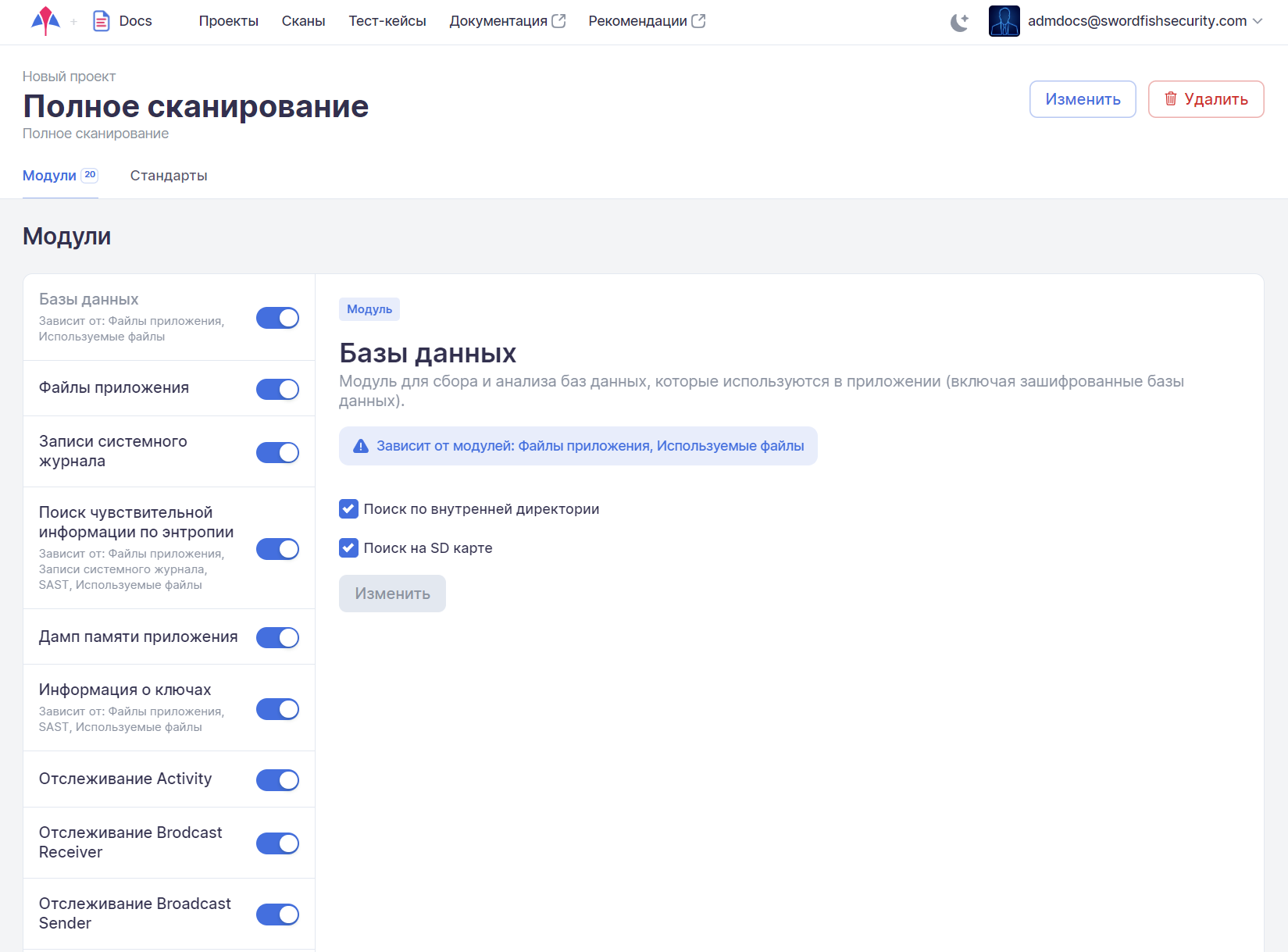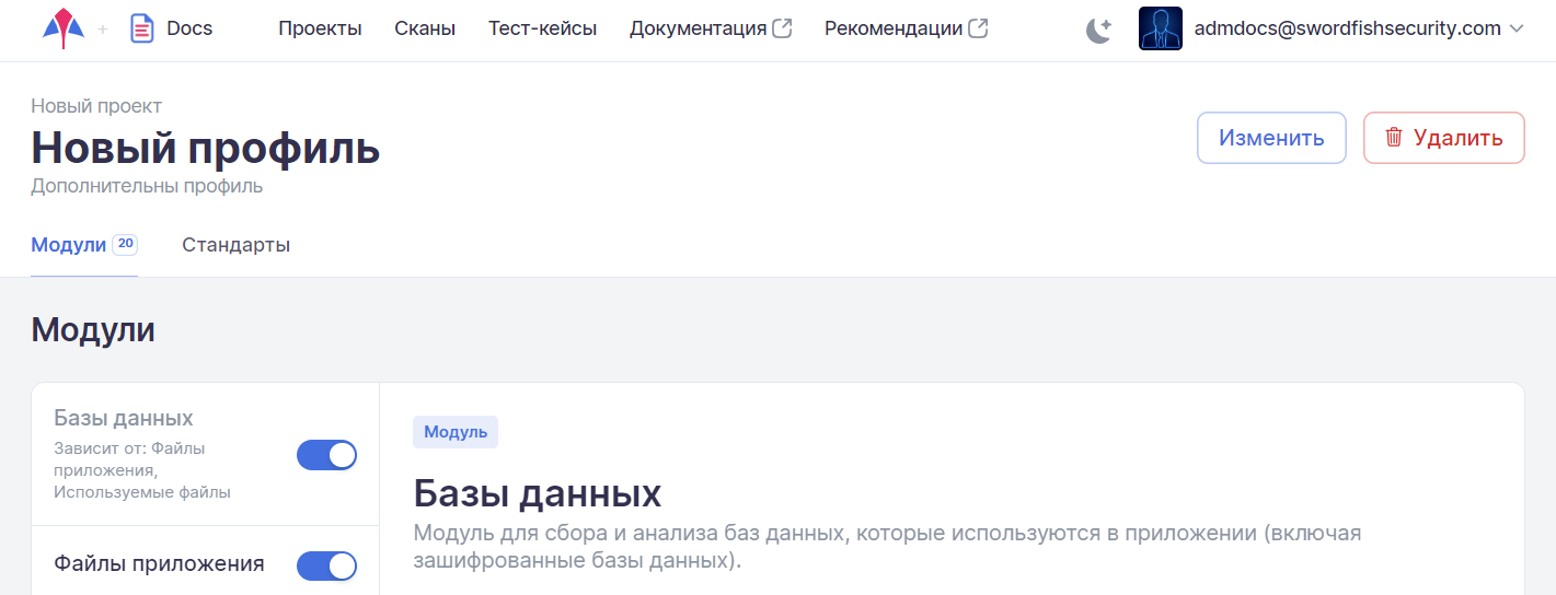 На странице профиля можно получить информацию о настройках модулей сканирования в данном профиле (включить, отключить или настроить их), просмотреть и включить или отключить стандарты безопасности, на соответствие которым будет проверяться анализируемое данным профилем приложение. В верхней части страницы представлена общая информация о профиле: