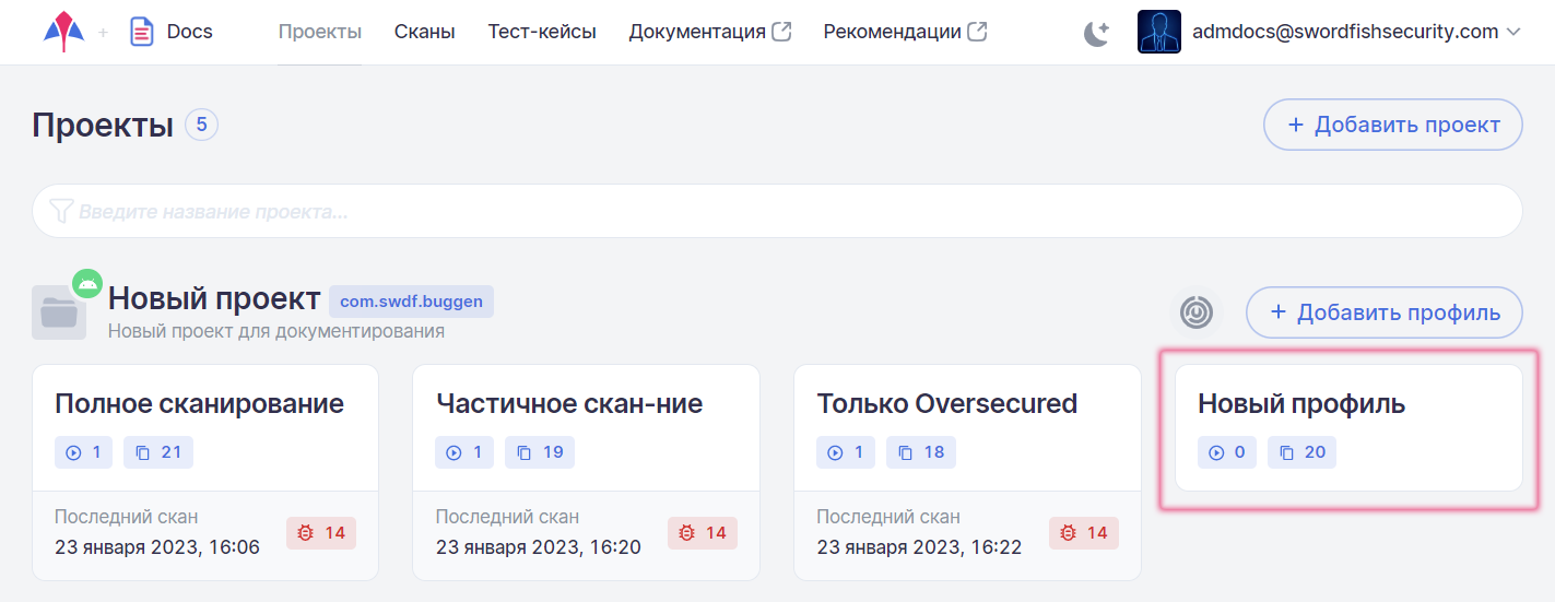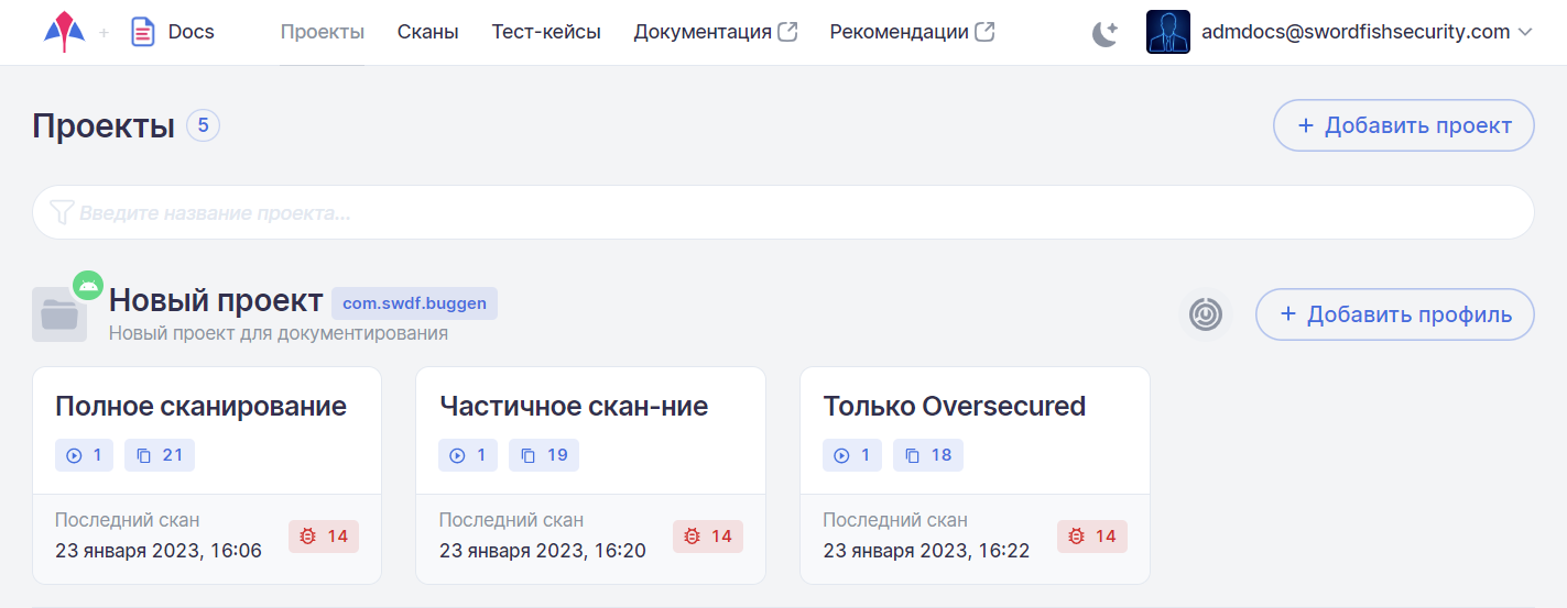 Профили сканирования относятся к проектам. На странице Проекты представлены все существующие в системе проекты и их профили сканирования. Каждый профиль представлен в виде карточки с краткой информацией о нем. Для каждого проекта показан список его профилей. На этой странице можно добавить новый профиль сканирования для существующего проекта или просмотреть информацию о существующих профилях.
