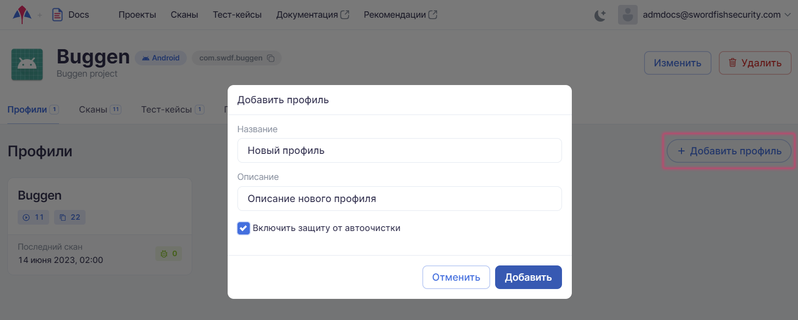 Для добавления нового профиля в проект нажмите на кнопку Добавить профиль справа в поле проекта. В появившемся окне Добавить профиль введите название профиля и его краткое описание, а затем нажмите на кнопку Добавить в правом нижнем углу окна. Если выбрана опция Включить защиту от автоочистки, данный профиль не будет удаляться при автоочистке, см. раздел «Автоочистка». Вновь созданный профиль появится в списке профилей проекта.