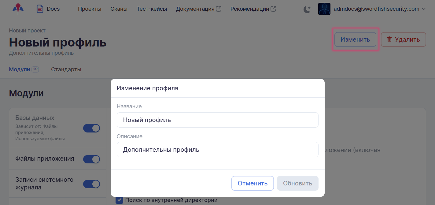 Чтобы отредактировать параметры профиля, нажмите на кнопку Изменить справа вверху. В появившемся окне можно изменить название и описание профиля.