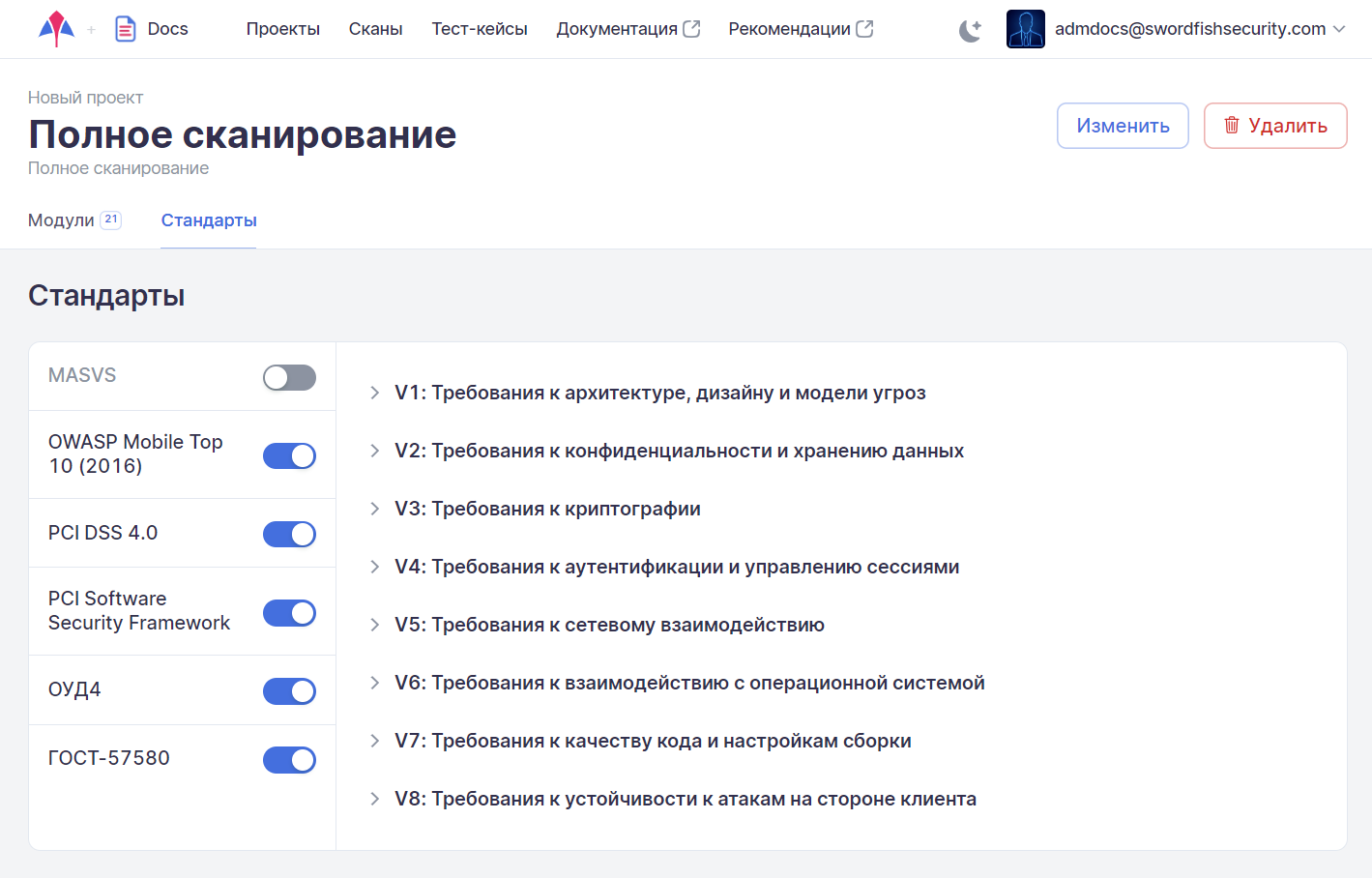 На данной вкладке доступно управление стандартами информационной безопасности, на соответствие которым будет проверено анализируемое приложение.