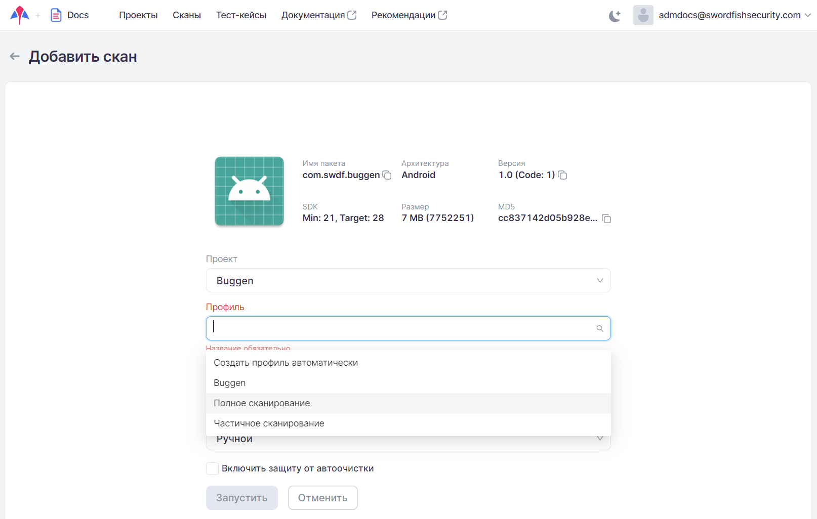Профиль — профиль, в рамках которого будет проводиться сканирование. Если приложение сканируется в системе впервые, в этом поле по умолчанию предлагается опция Создать профиль автоматически. Данная опция в поле Профиль работает аналогично приведенному выше ее описанию для поля Проект.
