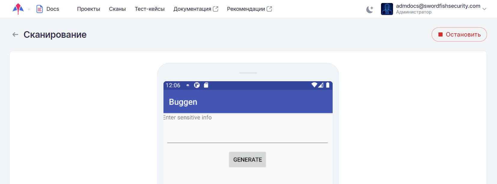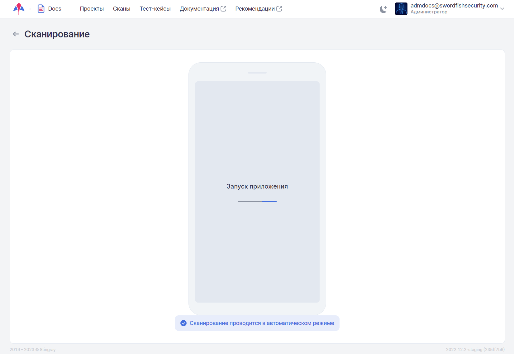 - Запущен — происходит процесс сканирования и взаимодействие с приложением, в зависимости от типа сканирования, вручную или через тест-кейсы.