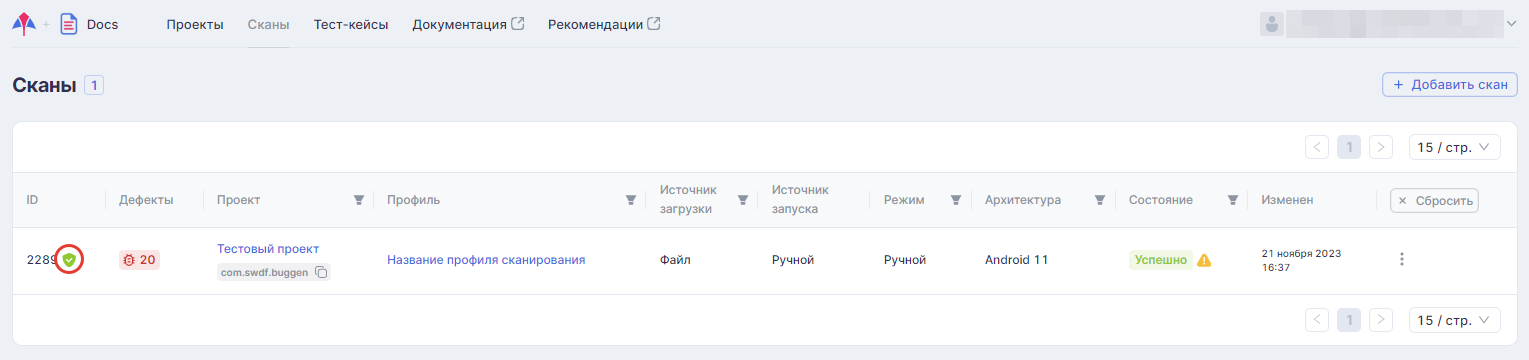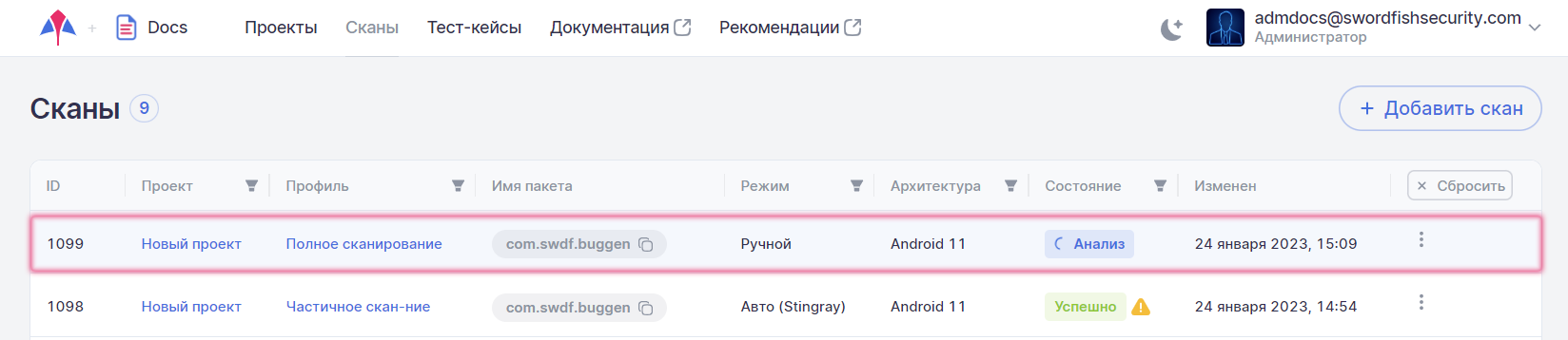 будет осуществлен переход к странице со списком всех сканирований. При переходе на страницу Сканы можно увидеть новую строку, отображающую текущий результат автоматического сканирования. При нажатии на ID тест-кейса, когда соответствующее сканирование имеет состояние Создан, Запускается или Запущен, происходит возврат на страницу с экраном устройства. После завершения сканирования приложения его состояние примет значение Анализ на время обработки полученных результатов. Затем состояние сканирования поменяется на Успешно или Неуспешно в зависимости от результата. Если нажать на ID тест-кейса, когда сканирование имеет состояние Анализ, Успешно или Неуспешно, произойдет переход на страницу с детальными результатами сканирования, см. раздел «Результаты сканирований».