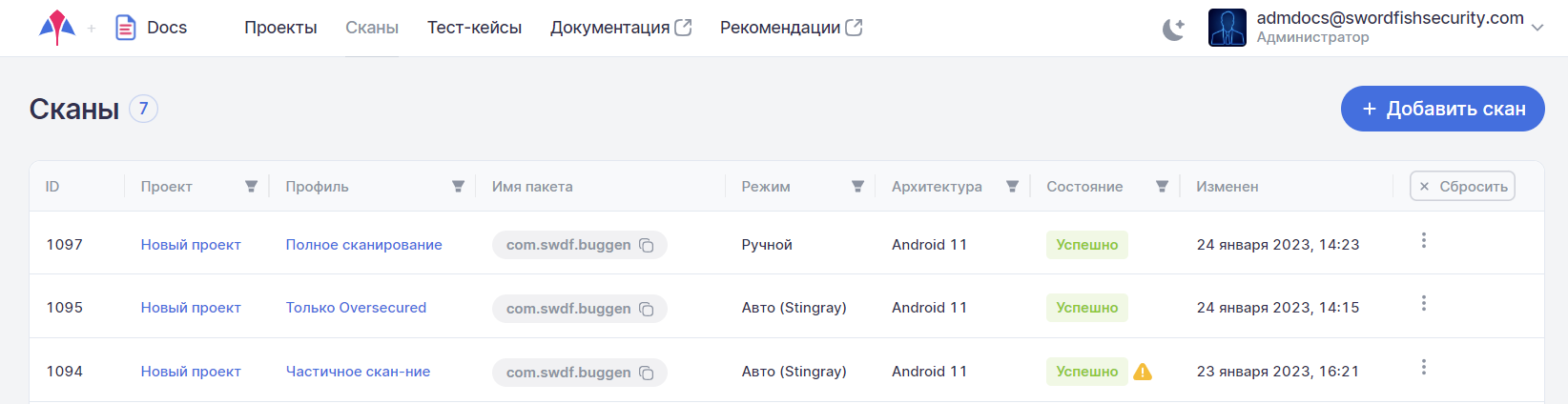 будет осуществлен переход к странице со списком всех сканирований. Идентифицировать полученные результаты ручного сканирования можно по данным в столбце Изменен.