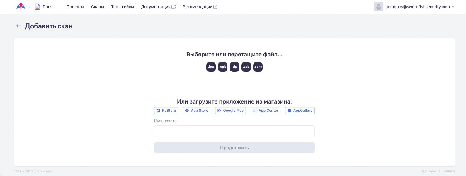 Выберите или перетащите на появившуюся страницу Добавить скан apk-, aab-, apks-, ipa- или zip-файл, содержащий split apk сканируемого приложения, или загрузите пакет из магазина приложений/системы дистрибуции/платформы разработки, указав его имя и/или другие необходимые параметры в соответствующих полях, а затем нажмите на кнопку Продолжить.