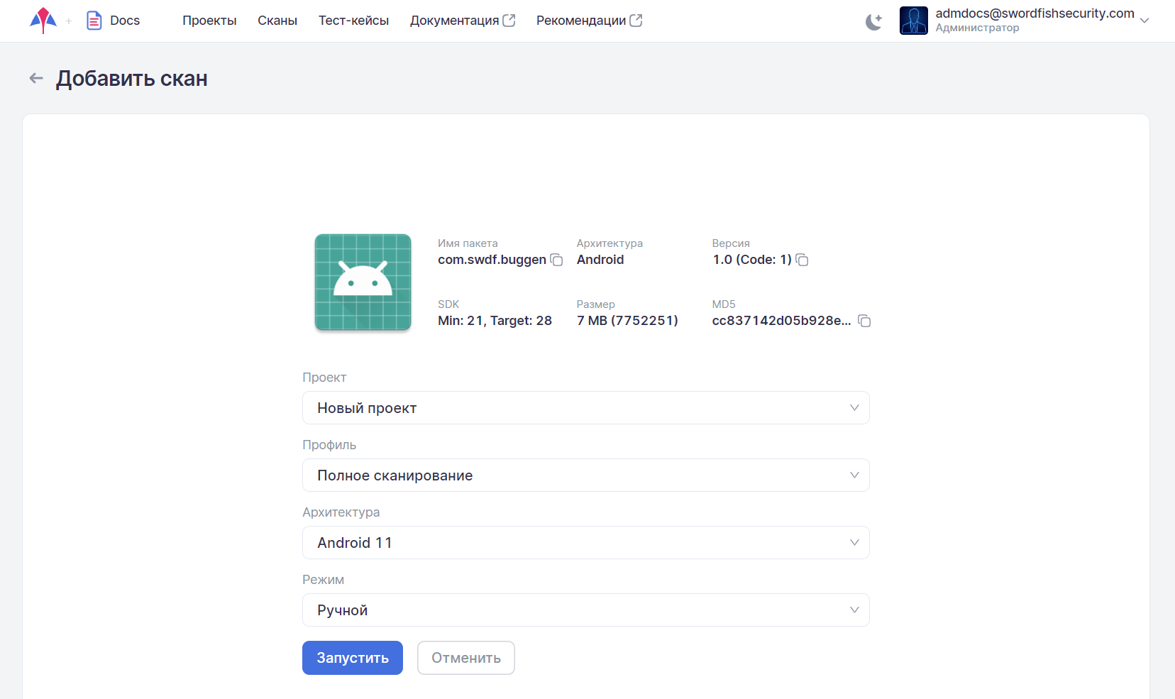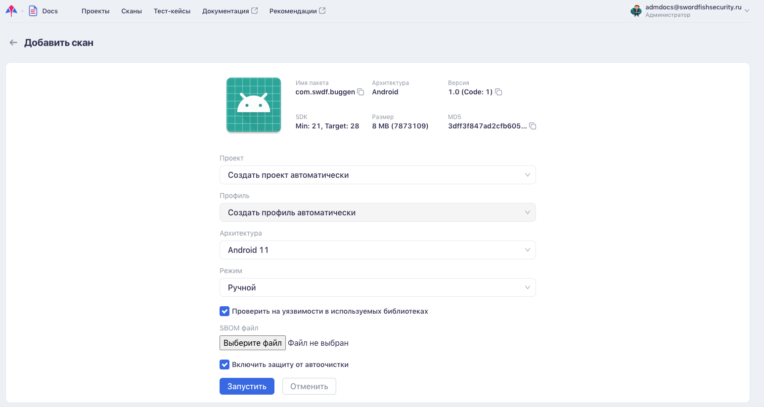 После выбора файла на странице Добавить скан будут представлены необходимые для запуска анализа приложения поля: