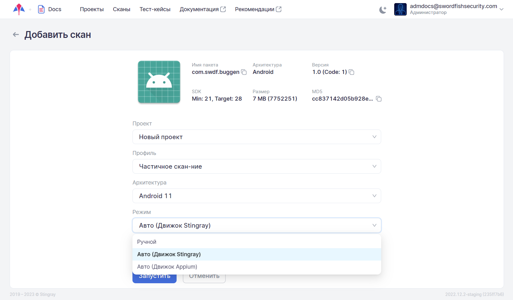 Режим — ручное или автоматическое (Stingray / Appium) сканирование.