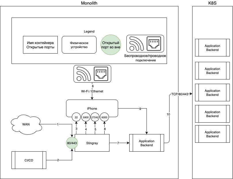 10 | Mobile Application Backend | K8S Microservices | 80/443 | HTTP | Доступ к сервисам тестирования. Необходим для отправки мобильных приложений в сервисы тестирования |